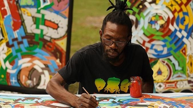 Pour décorer notre étiquette, nous avons fait appel (comme à chaque fois) pour nos brassins éphémères à un artiste local. Cette fois-ci, c’est Franky AMETE, le (plus ?) célèbre peintre et sculpteur tembé de Guyane qui a accepté.